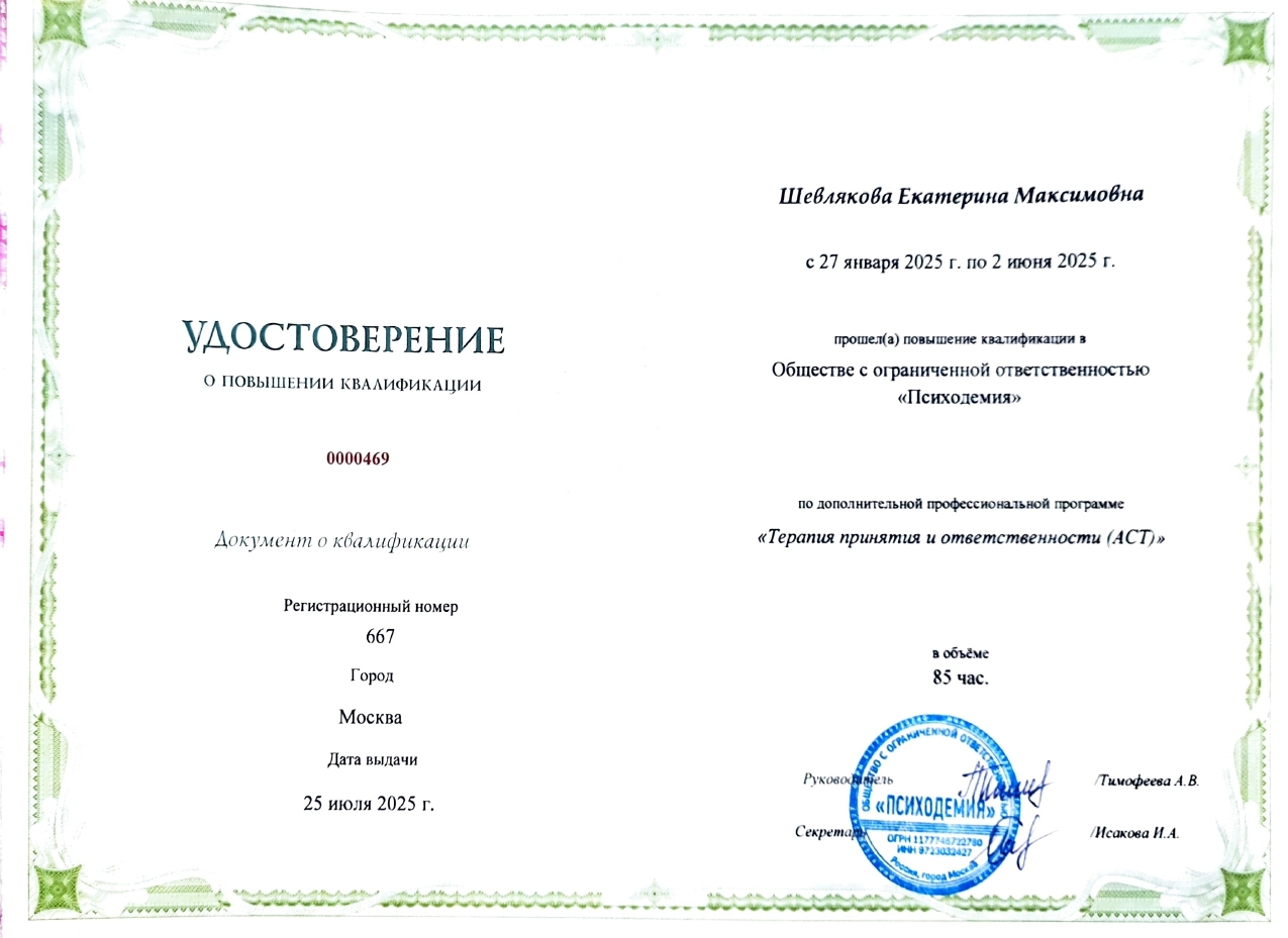 В работе я применяю техники ACT (Терапия принятия и ответственности), а также опираюсь на принципы гуманистической психологии и интерсубъективную модель психотерапии.
